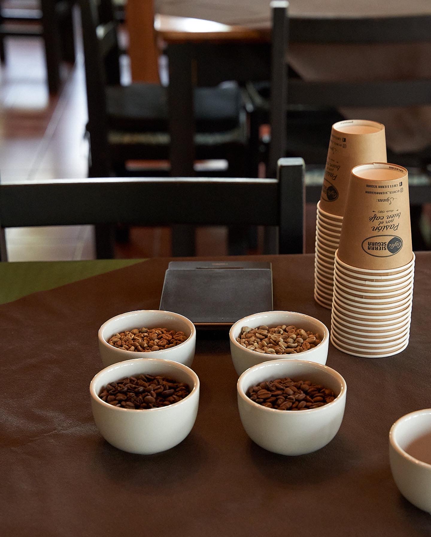 - Posteriormente bajamos a nuestra sala de catas, en la que previamente tostamos y preparamos una cata brasileña, tal y como hacen María y Marina cuando una nueva variedad de café llega al tostadero, poder experimentar de primera mano como hacer una cata de café es una de las partes que más impresiona a todo aquel que visita Cafés Sierra Segura.