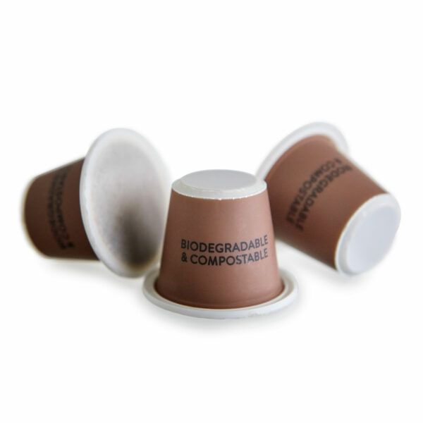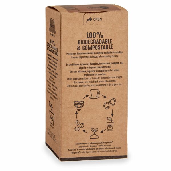 La caja contiene 10 cápsulas 100% compostables y biodegradables .
