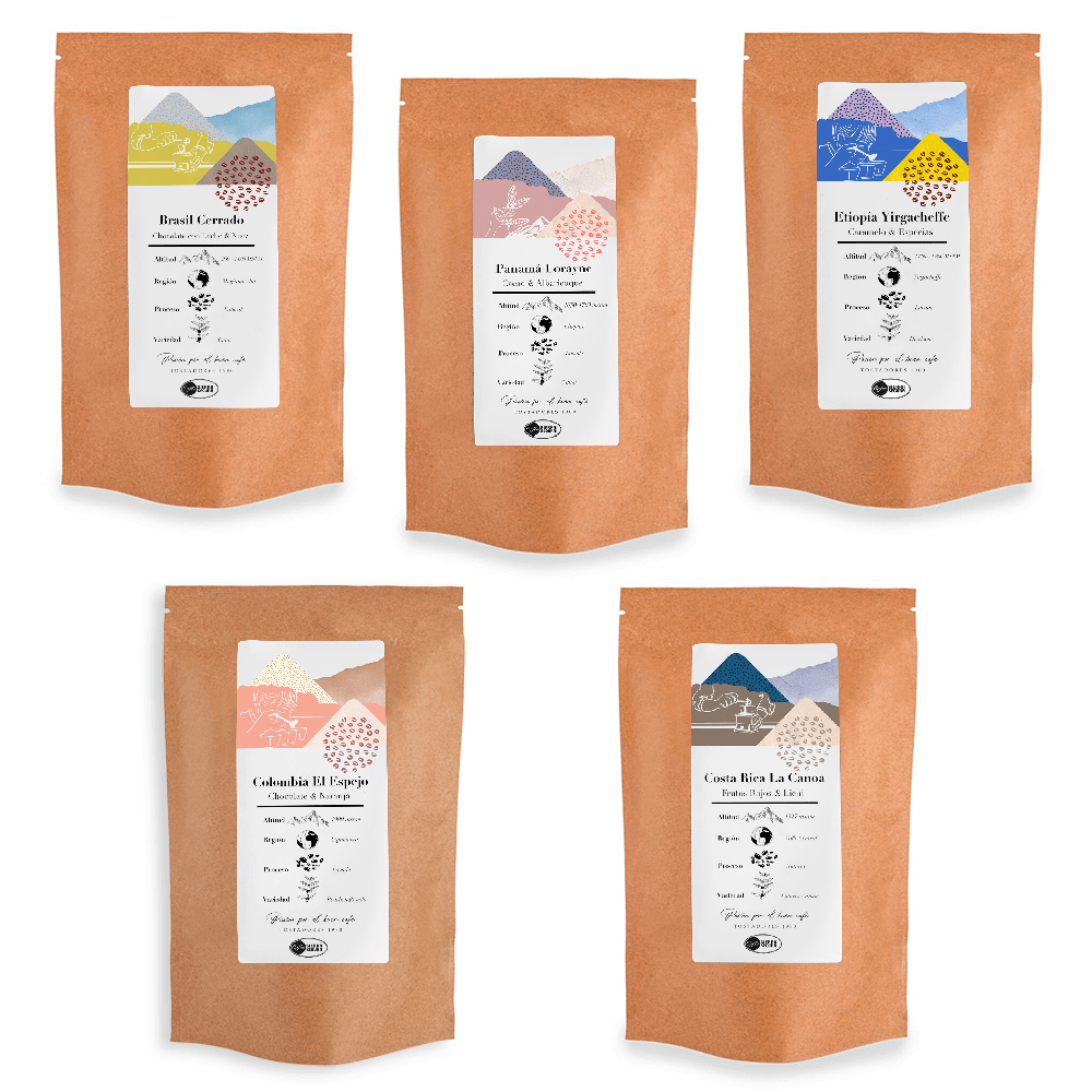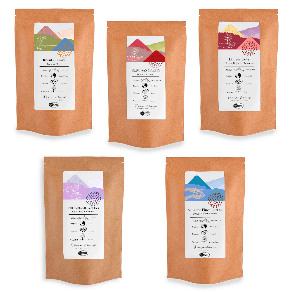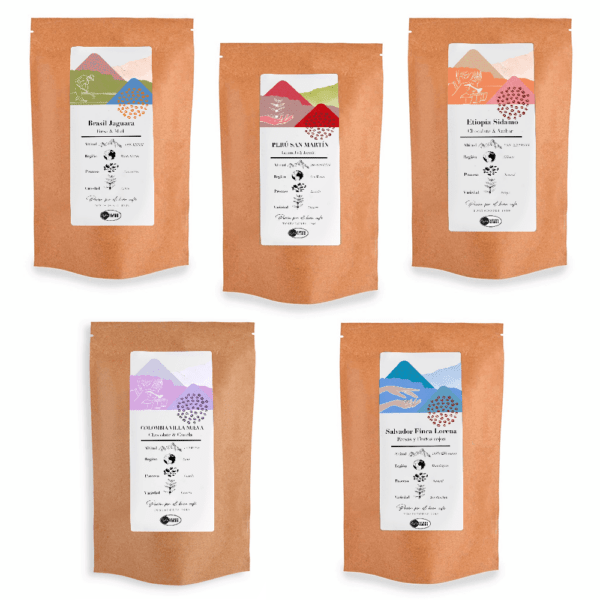 Un pack compuesto por cinco cafés muy diferentes, los últimos en llegar a nuestro tostadero y con los que podrás disfrutar cada día de un sabor diferente y especial, descubre las notas cítricas de nuestro café de Colombia “Villa Nueva”, los sabores más dulces del café de Brasil las notas a caramelo del favorito de la temporada de Salvador “Finca Lorena”.
